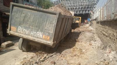 नगर निगम की सुस्ती और डम्पर की फजीहत: अधूरी भरी गई पाइप लाइन की खुदाई में फंसा भारी वाहन।