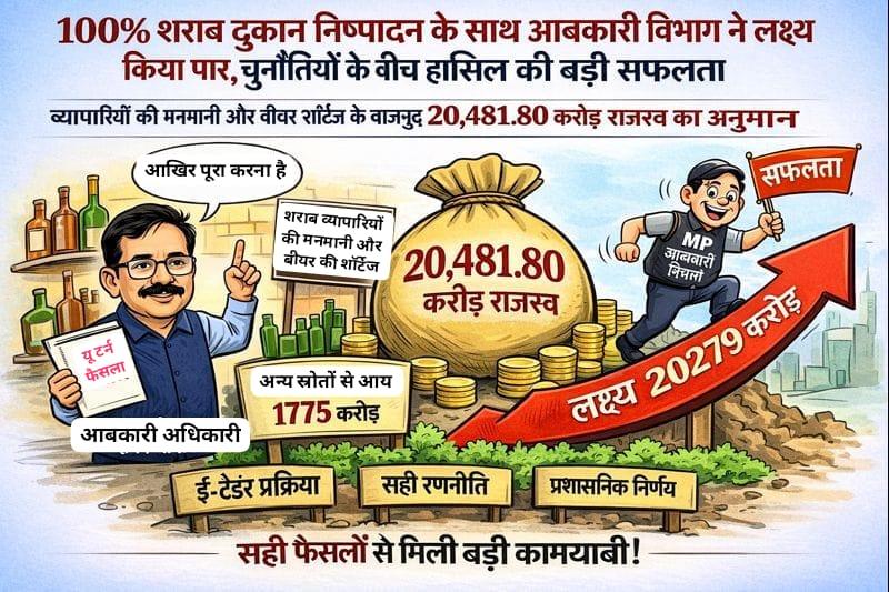 भोपाल। मध्यप्रदेश में वित्तीय वर्ष 2026-27 के लिए आबकारी विभाग ने सभी 3553 शराब दुकानों का सफलतापूर्वक निष्पादन कर एक बड़ी उपलब्धि दर्ज की है। विभाग को इन दुकानों से कुल 18,676.80 करोड़ रुपये का राजस्व प्राप्त हुआ है, जो पिछले वर्ष के वार्षिक मूल्य की तुलना में 12.33 प्रतिशत अधिक है। हालांकि इस पूरे वित्तीय वर्ष के दौरान शराब व्यापारियों की मनमानी और बीयर की शॉर्टेज जैसी समस्याएं भी सामने आईं। इन चुनौतियों के बीच आबकारी विभाग के कमिश्नर दीपक सक्सेना ने रेवेन्यू को अधिकतम स्तर तक पहुंचाने के लिए कई अहम फैसले लिए और जरूरत पड़ने पर यू-टर्न भी लिए। अंततः विभाग सरकार द्वारा निर्धारित लक्ष्य को हासिल करने में सफल रहा। दुकानों के अलावा अन्य स्रोतों से भी लगभग 1,775 करोड़ रुपये की आय होने का अनुमान है, जो दुकानों से प्राप्त राजस्व का करीब 9.5 प्रतिशत है। इस प्रकार कुल राजस्व संग्रह 20,481.80 करोड़ रुपये तक पहुंचने का अनुमान है।